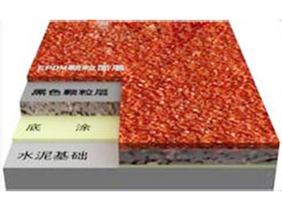 底层有PU(聚氨脂)粘结剂与跑道专用胶粒充分搅拌后,经专用铺装机械现场铺设而成,具有高度平整度及透水、透气功能。其面层用高强度PU和颗粒混合后,使用跑道专用喷涂机交叉喷绘二次,形成特殊的组织纹路,赋予面层良好的耐磨性和摩擦交合力。